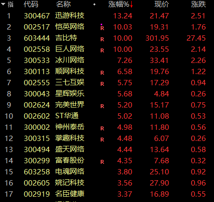 市场热点方面,游戏股今日高开高走,全天保持强势,板块指数盘中一度放量大涨逾6%,创2年来新高。恺英网络、吉比特、巨人网络等强势涨停。