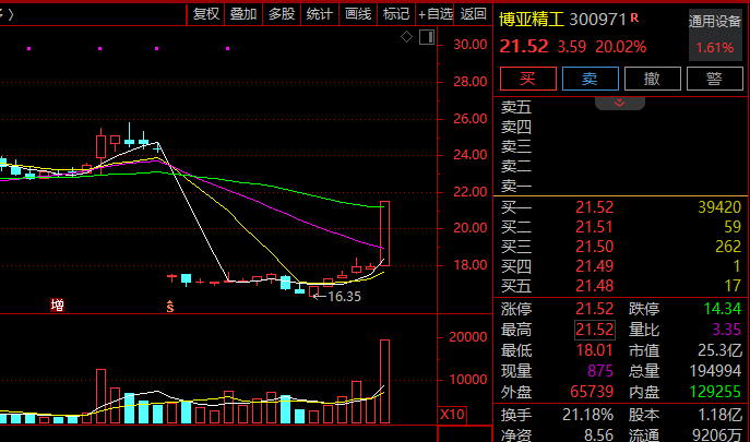 国防军工概念依旧火热,板块指数放量高开高走涨逾3%,创年内新高。博亚精工、恒宇信通、中光防雷、联建光电等多股20%涨停,北方导航、内蒙一机、中兵红箭等逾20股涨停或涨超10%。