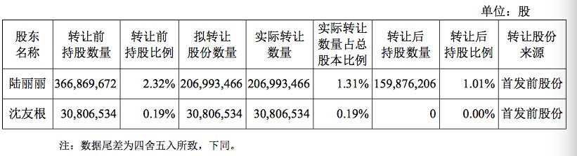本次转让中,陆丽丽实际减持2.07亿股,沈友根全额减持所持3080.65万股,最终两人合计转让2.378亿股,转让价格为24.40元/股,涉及总金额达58.02亿元。转让完成后,沈友根不再持有公司股份,陆丽丽持股比例降至1.01%,出让方及一致行动人合计持股比例降至20.39%,权益变动触及1%整数倍。