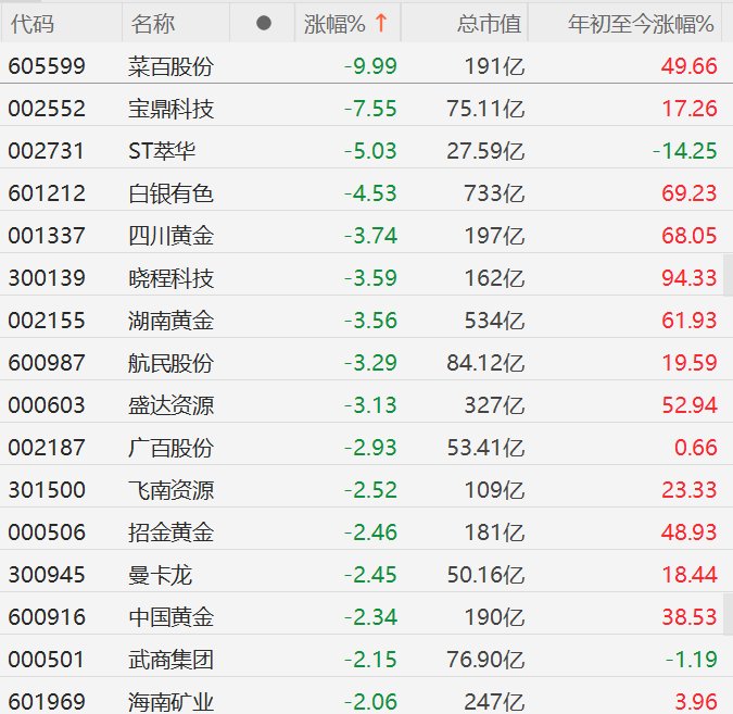 格隆汇2月10日|A股市场黄金概念股集体下跌,其中,菜百股份跌停,宝鼎科技跌超7%,白银有色跌超4%,四川黄金、晓程科技、湖南黄金、盛达资源跌超3%。