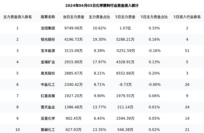 从主力资金流向来看,化学原料行业今日主力资金流入34.11亿元,在所有申万二级行业中排名:87/131。