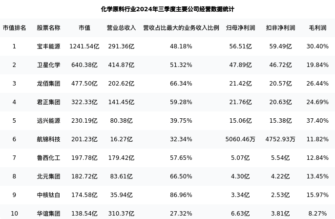君正集团最新报告期数据为三季度,下表汇总了化学原料行业内市值靠前的公司三季度主要经营数据