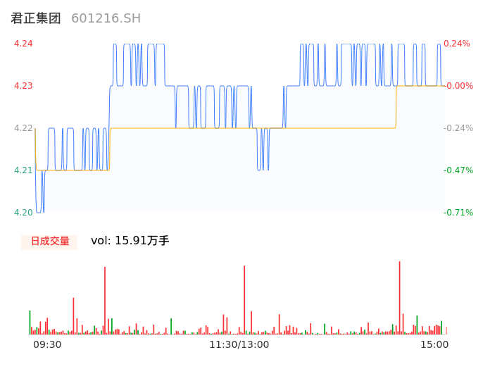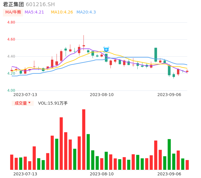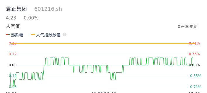 09月06日,君正集团收报4.23,股价涨幅0.00%,成交金额6726.90万元,换手率0.19%。