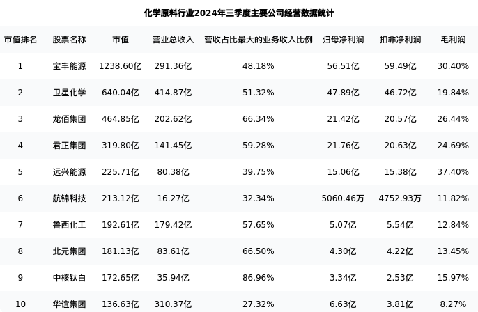 君正集团最新报告期数据为三季度,下表汇总了化学原料行业内市值靠前的公司三季度主要经营数据