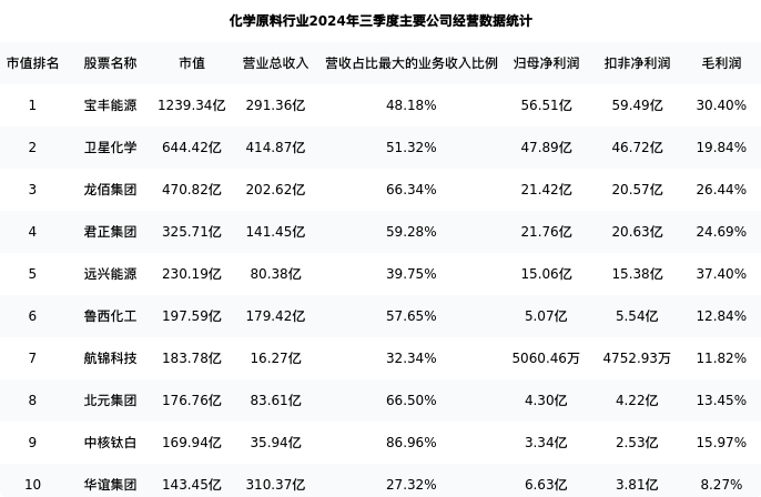 君正集团最新报告期数据为三季度,下表汇总了化学原料行业内市值靠前的公司三季度主要经营数据