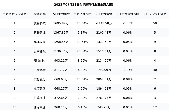 从主力资金流向来看,化学原料行业今日主力资金流入8.48亿元,在所有申万二级行业中排名:114/131。