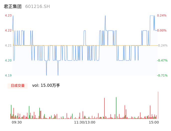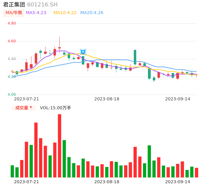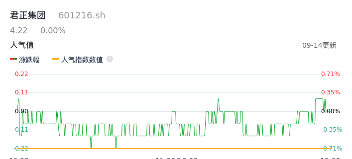 09月14日,君正集团收报4.22,股价涨幅0.00%,成交金额6316.09万元,换手率0.18%。