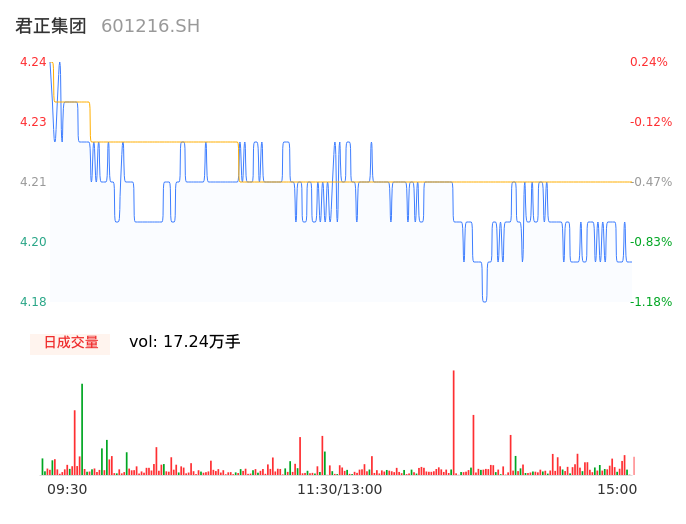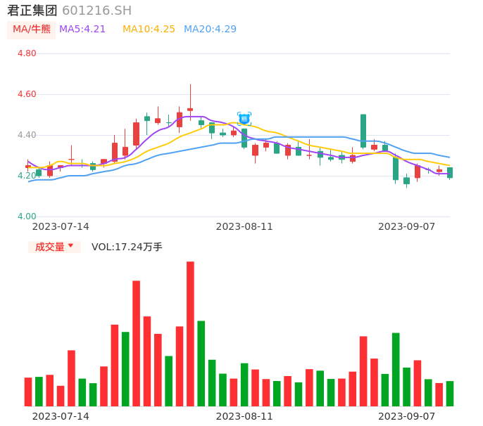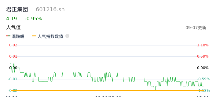 09月07日,君正集团收报4.19,股价涨幅-0.95%,成交金额7252.60万元,换手率0.20%。