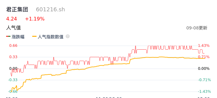 09月08日,君正集团收报4.24,股价涨幅1.19%,成交金额8959.46万元,换手率0.25%。