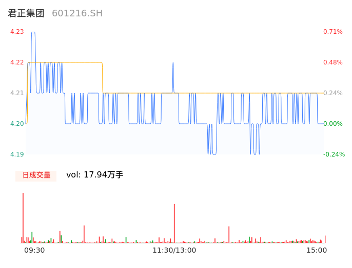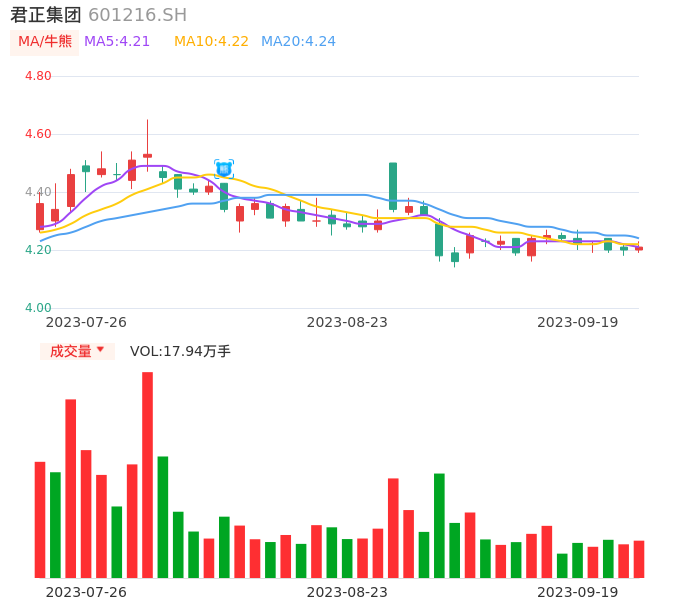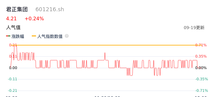 09月19日,君正集团收报4.21,股价涨幅0.24%,成交金额7550.51万元,换手率0.21%。