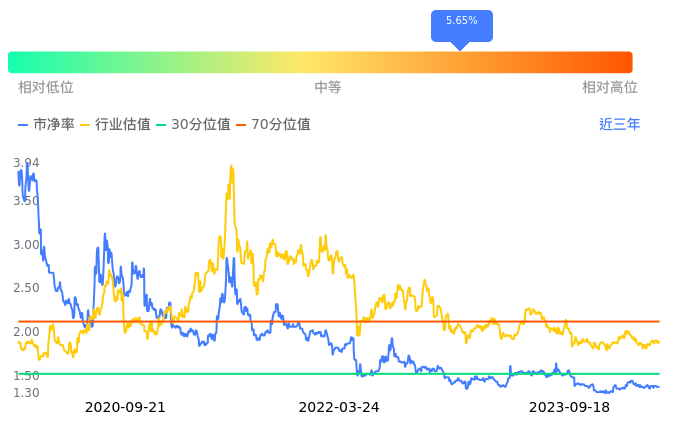 君正集团当前市净率PB为1.37,在所属的化学原料中,市净率PB排18,前五名分别为诚志股份市净率0.55、亿利洁能市净率0.61、华谊集团市净率0.67、鸿达兴业市净率0.68、中泰化学市净率0.77。君正集团当前市净率PB为1.37,超过近3年5.65%的历史数据。