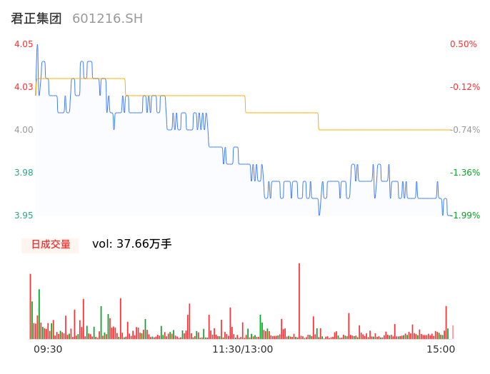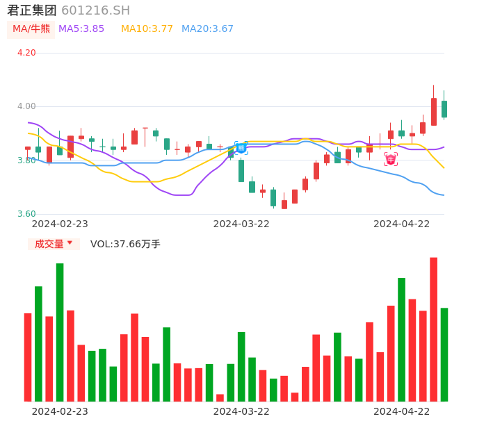 04月22日,君正集团收报3.96,股价涨幅-1.74%,成交金额1.50亿元,换手率0.45%。