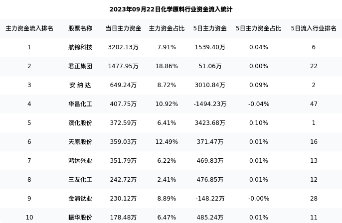 从主力资金流向来看,化学原料行业今日主力资金流入9.97亿元,在所有申万二级行业中排名:83/131。