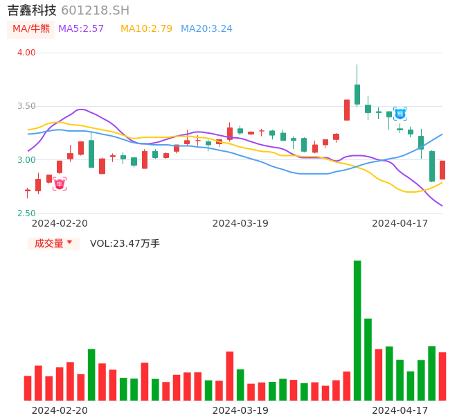 04月17日,吉鑫科技收报2.99,股价涨幅6.79%,成交金额6907.22万元,换手率2.40%。