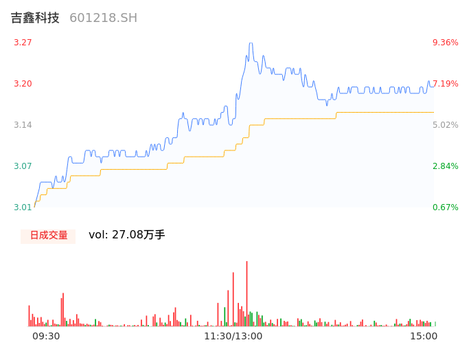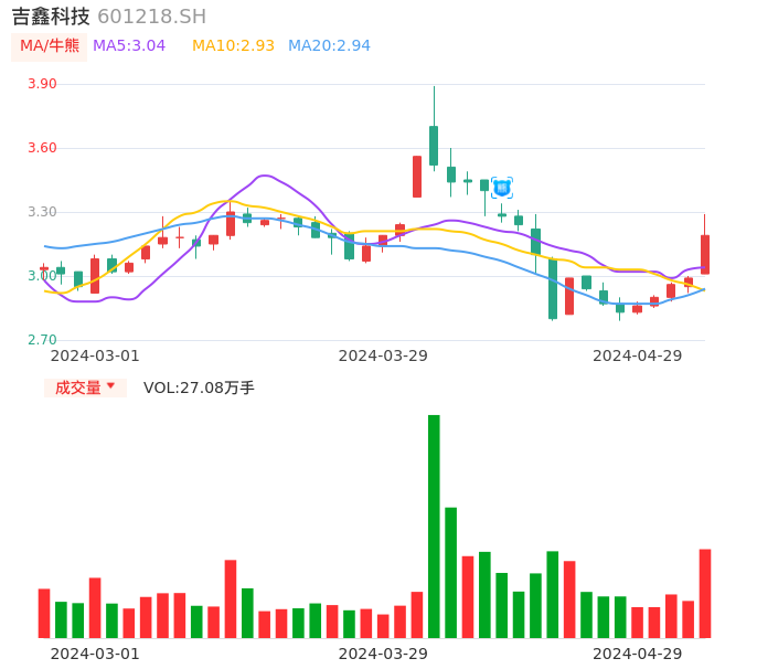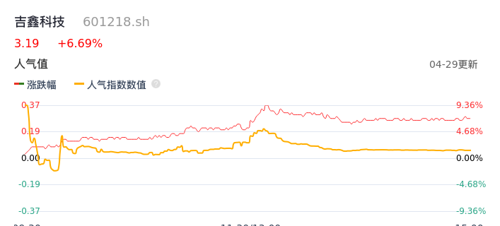 04月29日,吉鑫科技收报3.19,股价涨幅6.69%,成交金额8557.08万元,换手率2.77%。