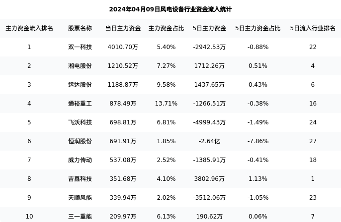 从主力资金流向来看,风电设备行业今日主力资金流入8.33亿元,在所有申万二级行业中排名:20/131。