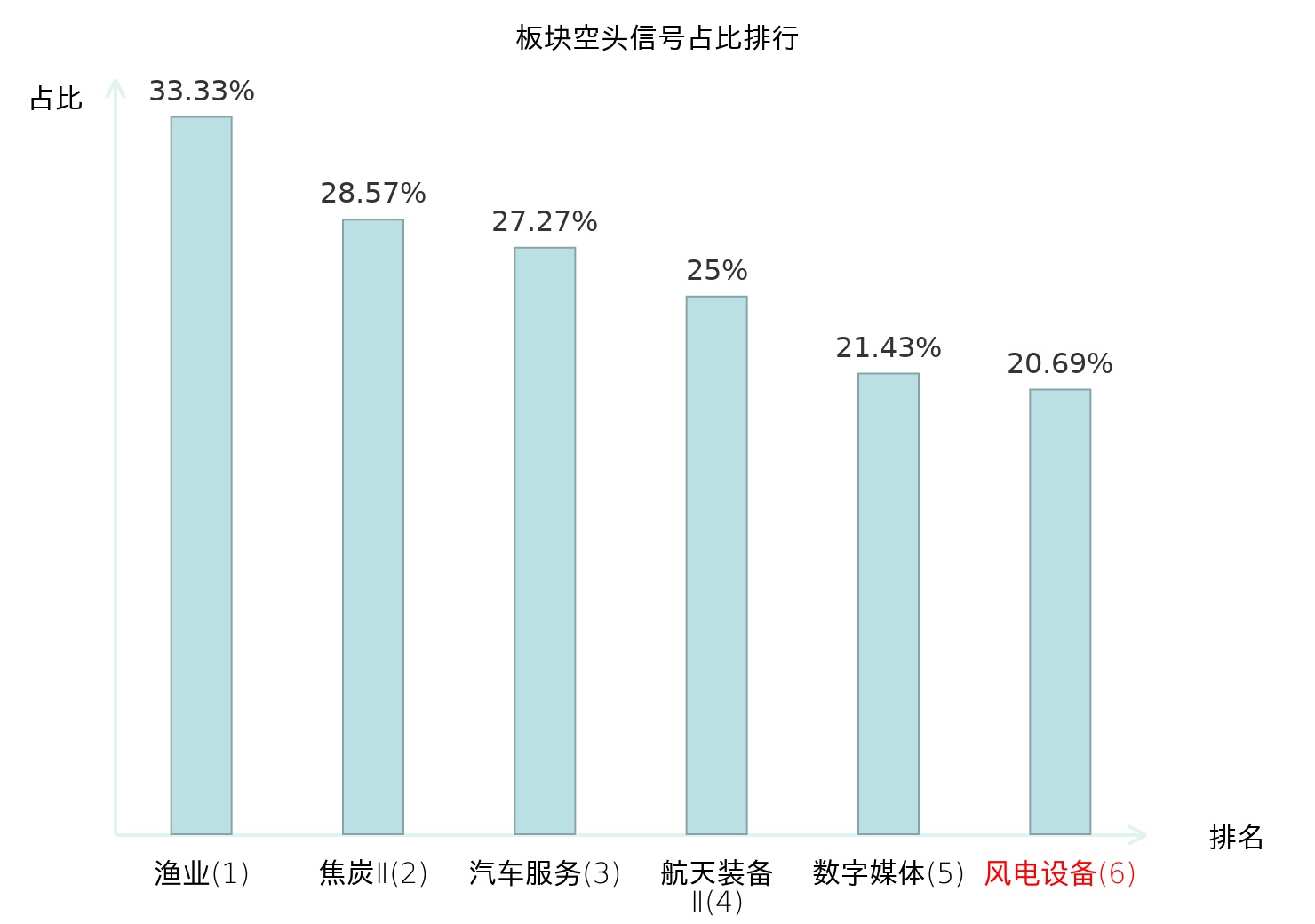 全市场所有行业板块中主力空头信号占比排名中,渔业板块位居第一。电子化学品Ⅱ板块名次提升最快,较昨日上升116位。