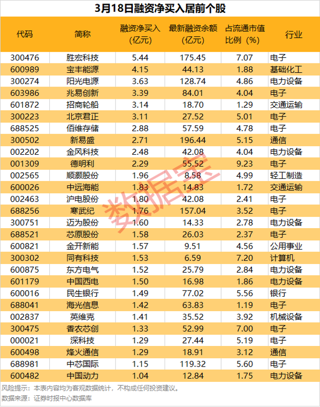 统计显示,具体到个股,3月18日共有1844股获融资净买入,净买入金额在千万元以上的有444股,其中28股融资净买入额均超1亿元。