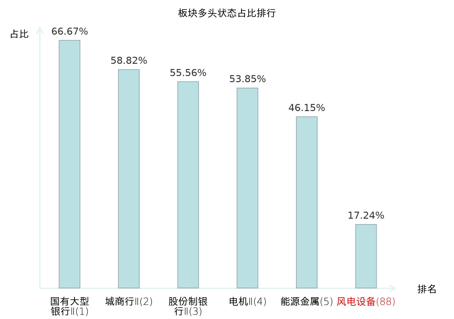 全市场所有行业板块中主力多头状态占比排名中,国有大型银行Ⅱ板块位居第一。自动化设备板块名次提升最快,较昨日上升57位。