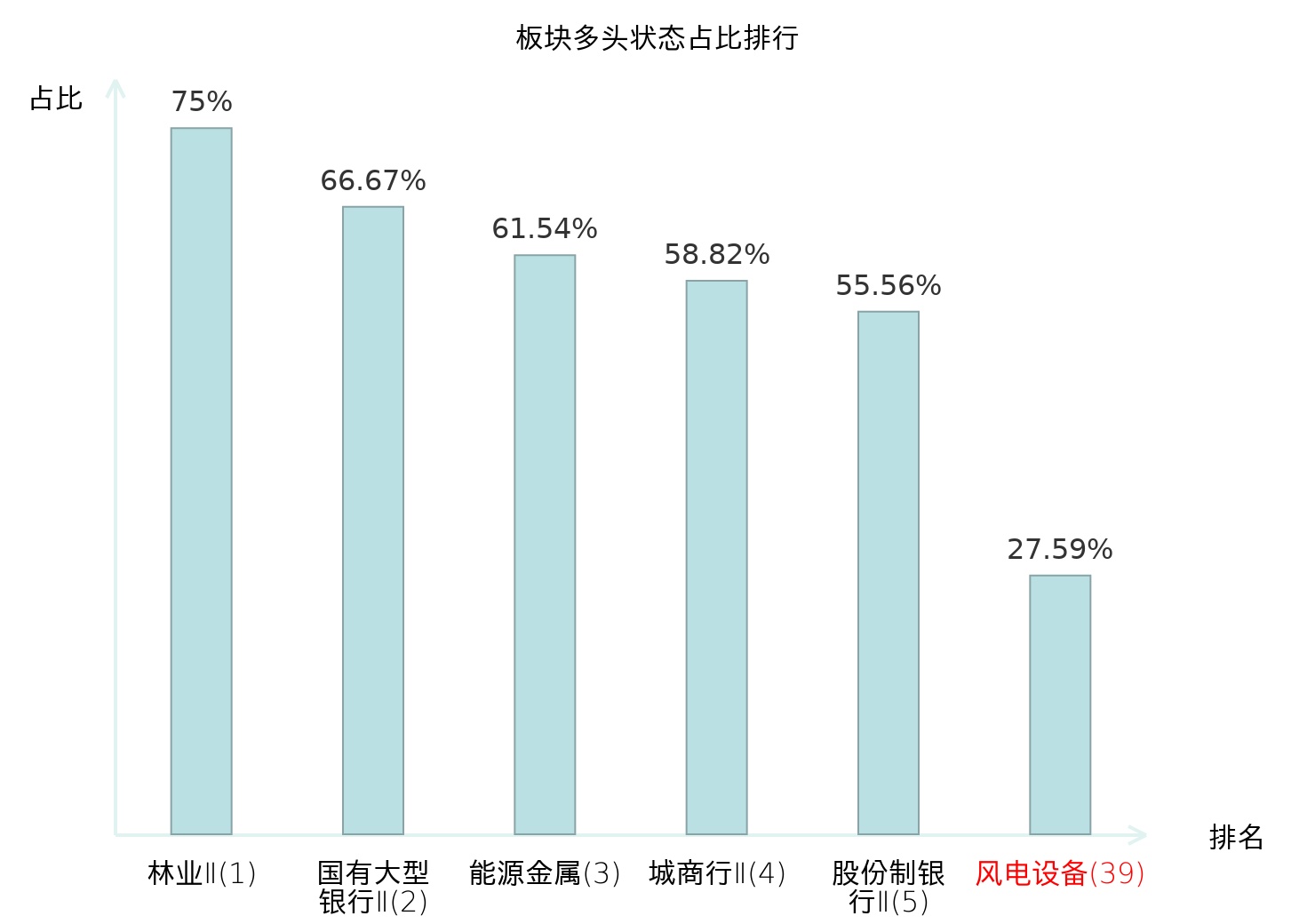 全市场所有行业板块中主力多头状态占比排名中,林业Ⅱ板块位居第一。专业连锁Ⅱ板块名次提升最快,较昨日上升63位。