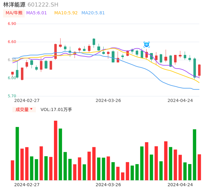 04月24日,林洋能源收报6.22,股价涨幅3.49%,成交金额1.04亿元,换手率0.83%。