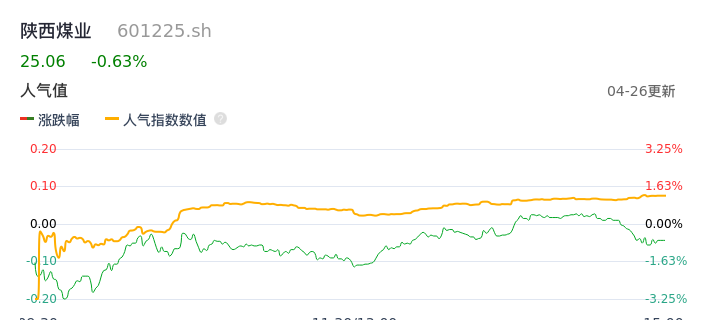 04月26日,陕西煤业收报25.06,股价涨幅-0.63%,成交金额16.46亿元,换手率0.68%。
