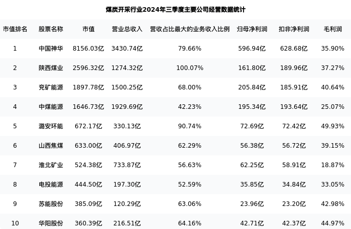 陕西煤业最新报告期数据为三季度,下表汇总了煤炭开采行业内市值靠前的公司三季度主要经营数据