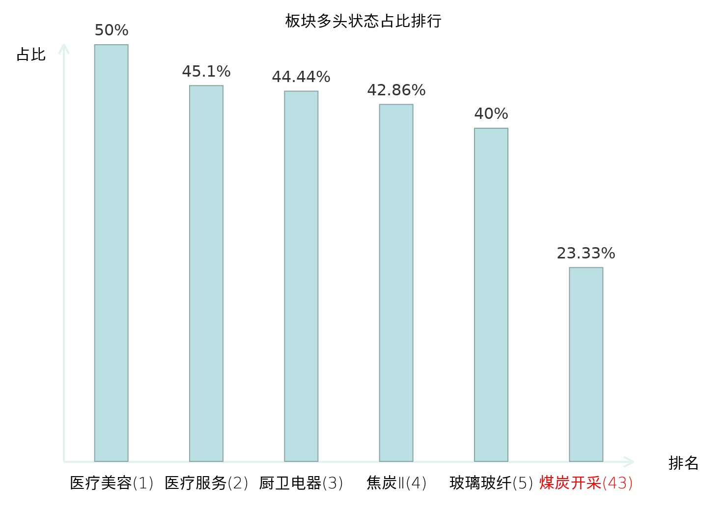 全市场所有行业板块中主力多头状态占比排名中,医疗美容板块位居第一。养殖业板块名次提升最快,较昨日上升90位。
