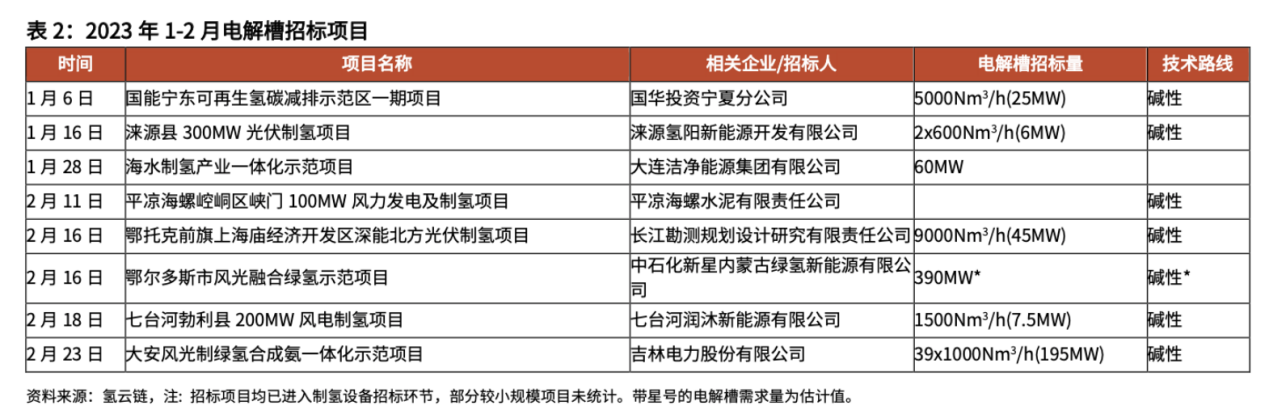 今年以来,氢能产业化提速下电解槽设备出货量正显著提升。近日数据显示,2023年1-2月,已公开招标电解槽的绿氢项目共8个,合计电解槽招标量达763.5MW,同比增长近3倍,并已超过2022年国内电解槽出货量(近750MW)。