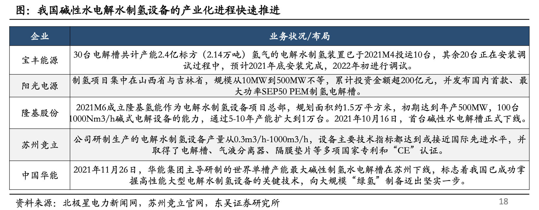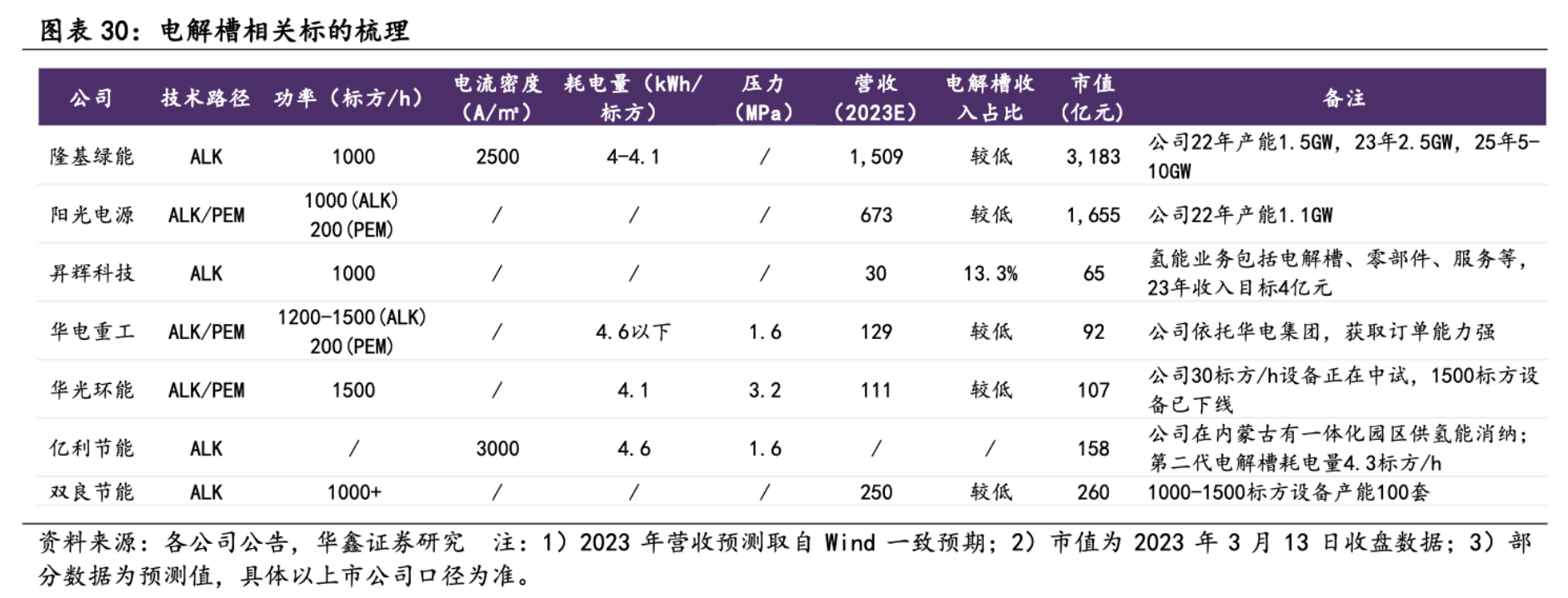 另外,昇辉科技,华电重工,华光环能,亿利洁能等新兴势力正依托各自技术等优势推进传统业务协同或转型,切入电解水制氢设备市场。昇辉科技参股投资3家氢能产业链头部企业,子公司1000标方碱性电解水制氢成套设备今年1月在佛山成功下线;华光环能是全国水处理设备科研中心和最大的制造基地,去年年底公司碱性电解水制氢30Nm3/h中试装置发运完成;双良节能单台电解槽功率可达1000-1500Nm³/h,现有年产能100套。