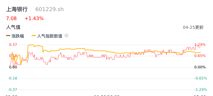 04月25日,上海银行收报7.08,股价涨幅1.43%,成交金额1.90亿元,换手率0.19%。