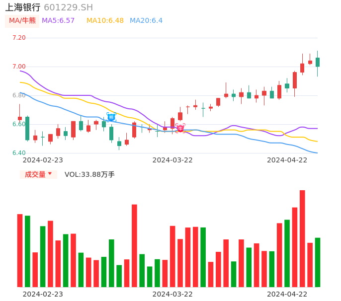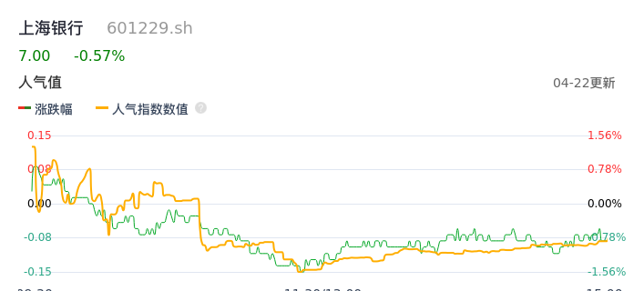 04月22日,上海银行收报7.00,股价涨幅-0.57%,成交金额2.37亿元,换手率0.24%。