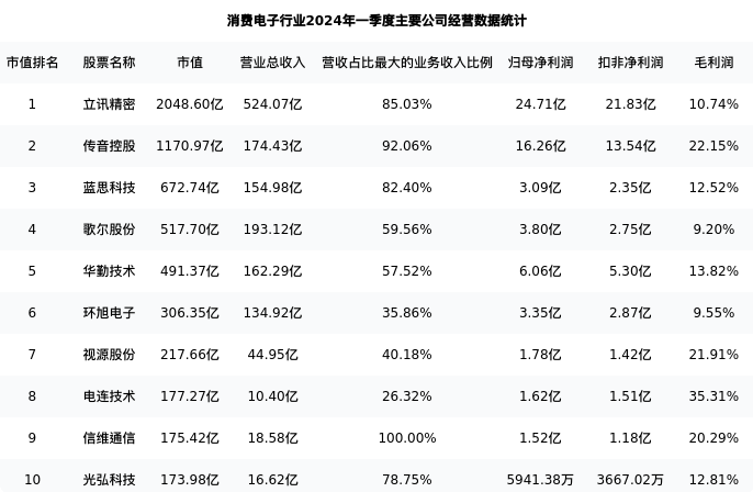 环旭电子最新报告期数据为一季度,下表汇总了消费电子行业内市值靠前的公司一季度主要经营数据