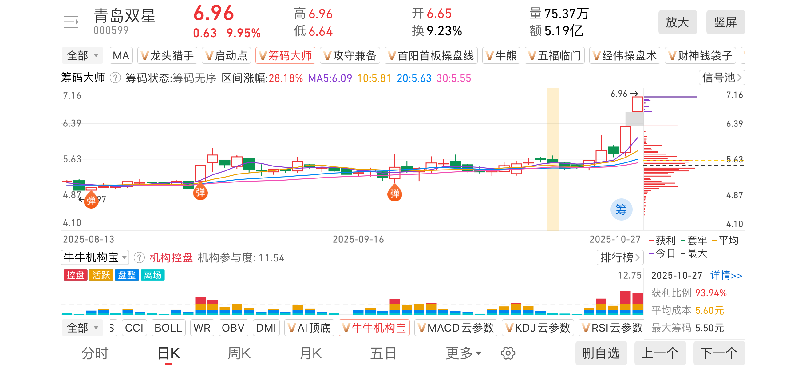 3)20251027-青岛双星-【筹码大师】和【牛牛机构宝】-近期出现弹信号且底部量柱由绿转红