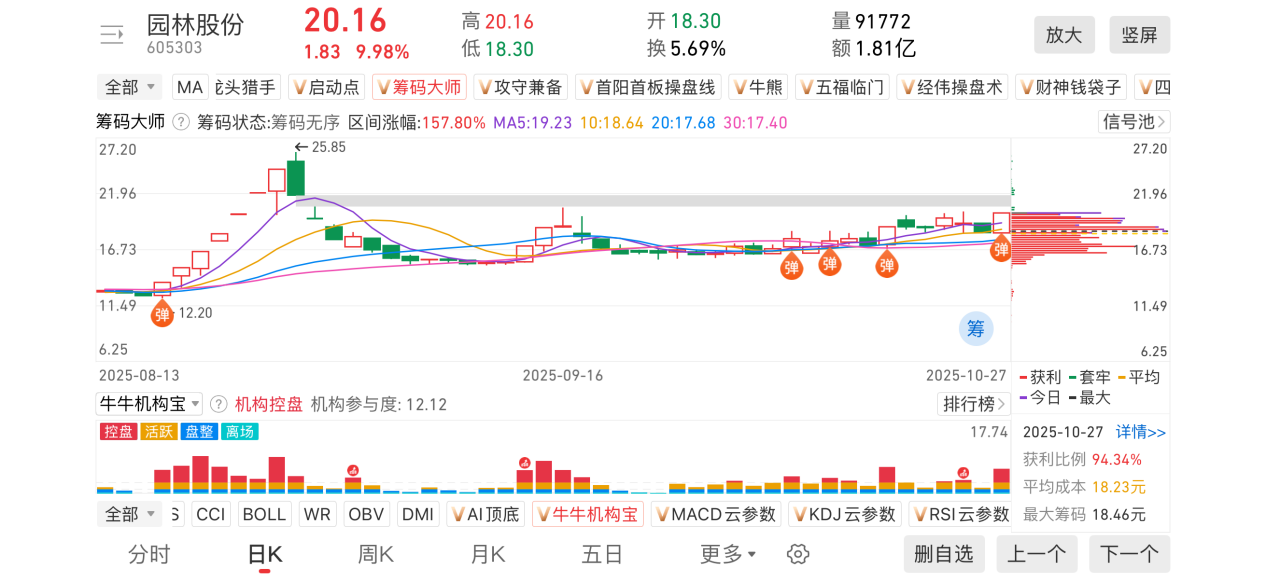 1)20251027-园林股份-【筹码大师】和【牛牛机构宝】-近期出现弹信号且底部量柱由绿转红