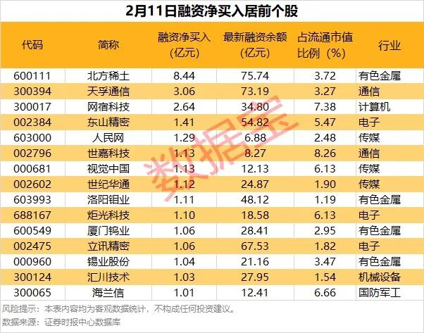 截至2月11日,市场融资余额合计2.63万亿元,较前一交易日减少159.17亿元。具体到个股,2月11日共有1312股获融资净买入,净买入金额在千万元以上的有295股,其中15股融资净买入额超1亿元。北方稀土融资净买入额居首,当日净买入8.44亿元;其次是天孚通信网宿科技,融资净买入金额分别为3.06亿元、2.64亿元;融资净买入金额居前的还有东山精密人民网世嘉科技等。分行业统计,获融资客净买入超亿元个股中,有色金属、传媒、电子等行业较为集中,分别有4只、3只、3只个股上榜。