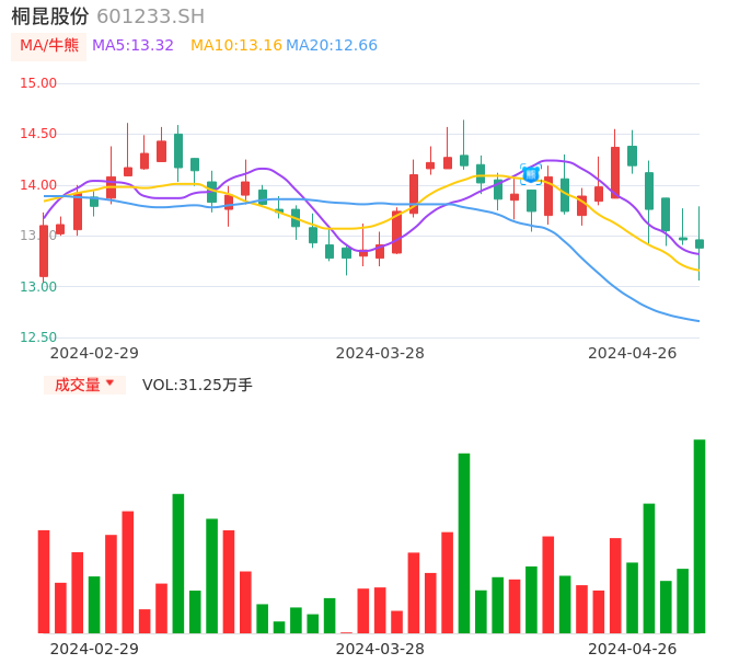 桐昆股份在4月12日出现日线级别熊点,且60分钟级别也处于熊点区间,股价处于偏弱行情,注意下方多方炮K线组合支撑位:13.04元,如果被有效跌穿将进入快速下降通道。