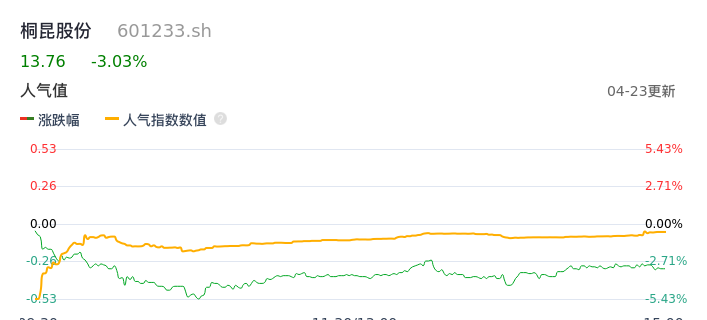 04月23日,桐昆股份收报13.76,股价涨幅-3.03%,成交金额3.32亿元,换手率1.07%。