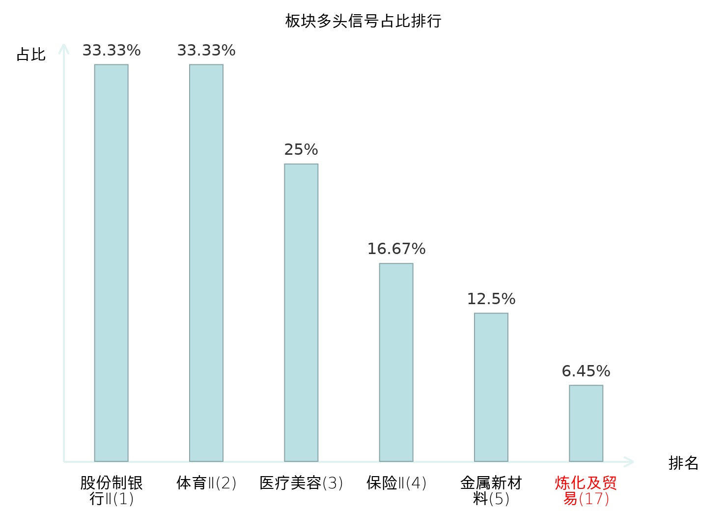 全市场所有行业板块中主力多头信号占比排名中,股份制银行Ⅱ板块位居第一。体育Ⅱ板块名次提升最快,较昨日上升128位。