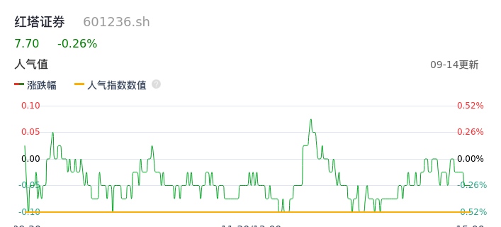 09月14日,红塔证券收报0.00,股价涨幅-0.26%,成交金额0.00元,换手率0.00%。