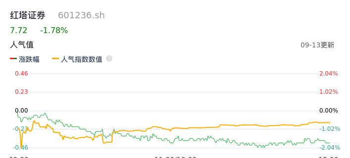 09月13日,红塔证券收报7.72,股价涨幅-1.78%,成交金额1.64亿元,换手率0.45%。