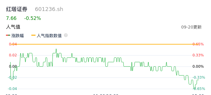 09月20日,红塔证券收报7.66,股价涨幅-0.52%,成交金额1.01亿元,换手率0.28%。
