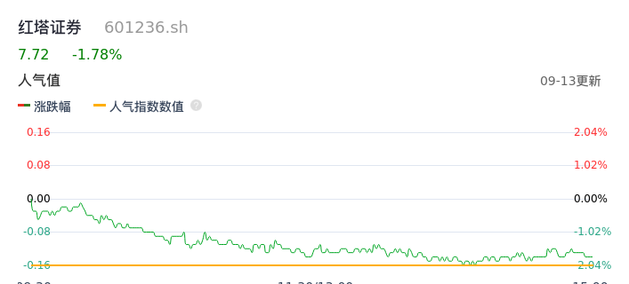 09月13日,红塔证券收报7.72,股价涨幅-1.78%,成交金额1.64亿元,换手率0.45%。