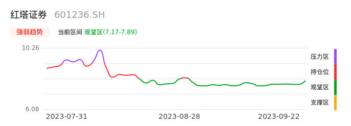 我们来看一下该股的九方特色指标强弱趋势的情况:红塔证券自08月30日从持仓区下穿到观望区。股价近期持续下跌后,短期出现止跌迹象。后续重点关注能否再次站上多空分界点:7.89元。如未能有效突破则可能进入新一轮空头行情。