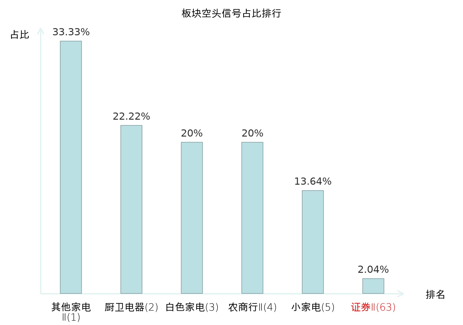 全市场所有行业板块中主力空头信号占比排名中,其他家电Ⅱ板块位居第一。地面兵装Ⅱ板块名次提升最快,较昨日上升107位。