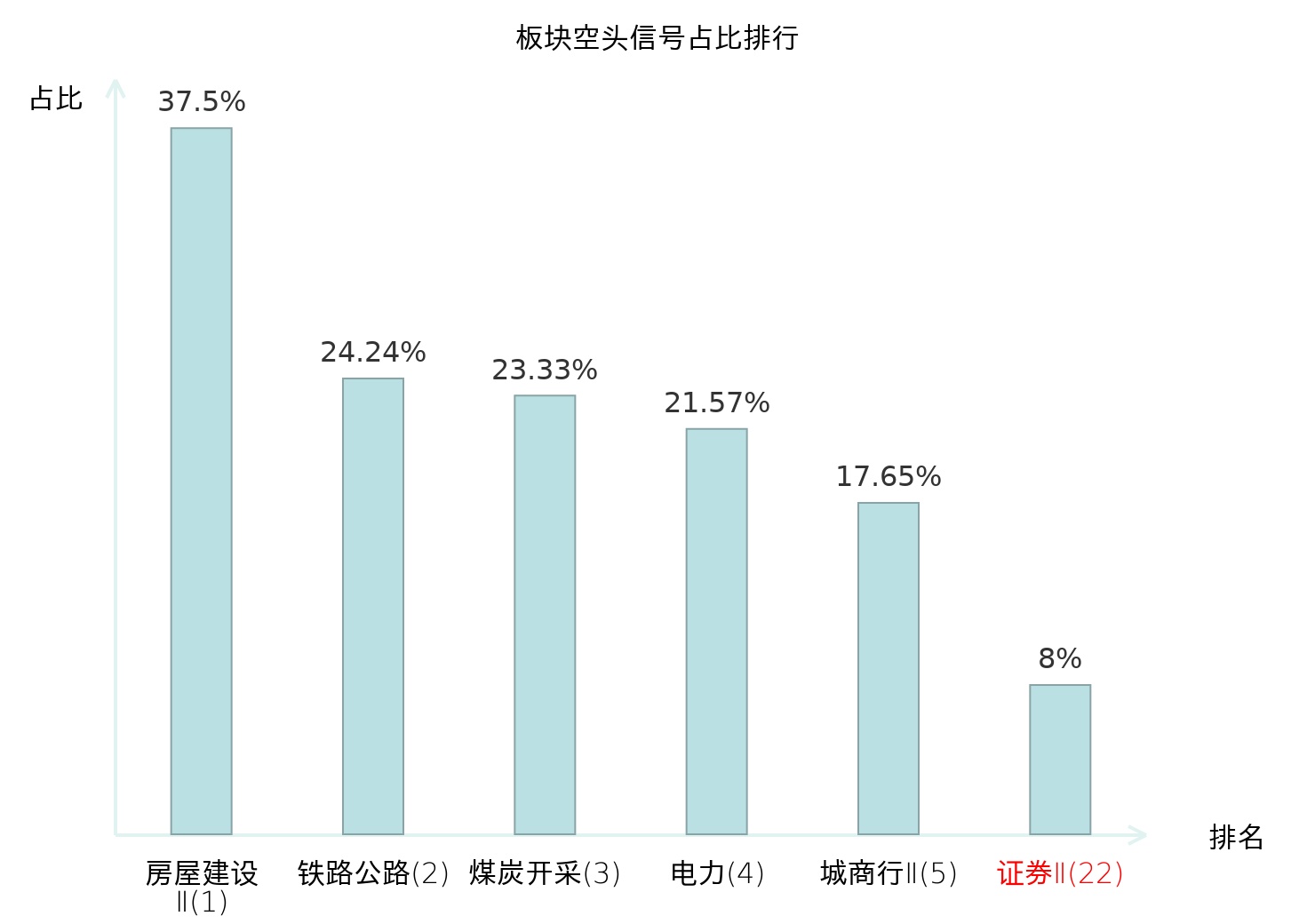全市场所有行业板块中主力空头信号占比排名中,房屋建设Ⅱ板块位居第一。煤炭开采板块名次提升最快,较昨日上升117位。