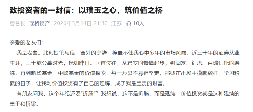 曹名长在璞桥资产官微最新撰文,总结了投资生涯过往,也展望了未来。他表示,自己如今站在职业生涯的新起点,发起设立上海璞桥私募基金管理有限公司。“璞桥”这个名字,是公司深思熟虑后定下的。“璞”,代表着未经雕琢的玉,寓意着那些被市场低估、具有潜力的公司,也代表坚持价值投资的初心;“桥”,则象征着连接,希望通过价值投资,搭建起资金与潜力公司之间的桥梁,让资金能够流向真正需要的地方,进而帮助投资者实现长期资产配置目标。