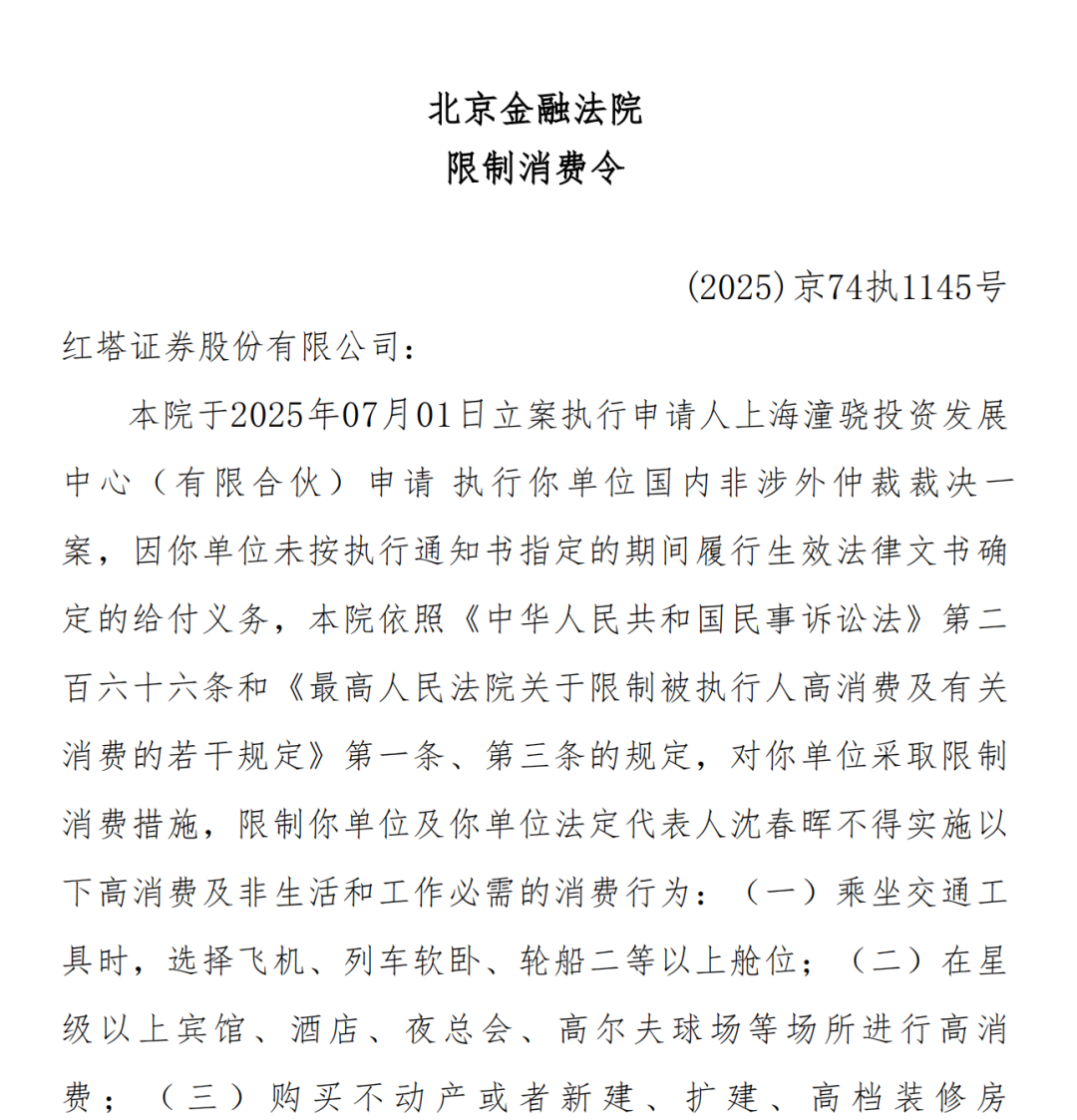 据悉,由于红塔证券未按执行通知书指定的期间履行生效法律文书确定的给付义务,北京金融法院依照《中华人民共和国民事诉讼法》《最高人民法院关于限制被执行人高消费及有关消费的若干规定》等相关规定,对红塔证券采取限制消费措施,该公司及其法定代表人不得实施高消费及非生活和工作必需的消费行为。