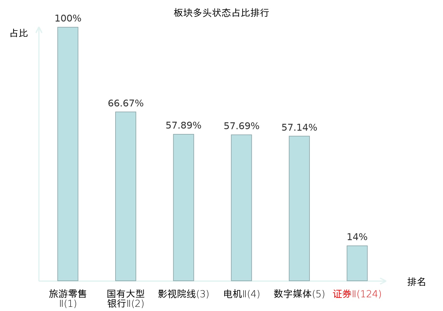全市场所有行业板块中主力多头状态占比排名中,旅游零售Ⅱ板块位居第一。专业连锁Ⅱ板块名次提升最快,较昨日上升56位。