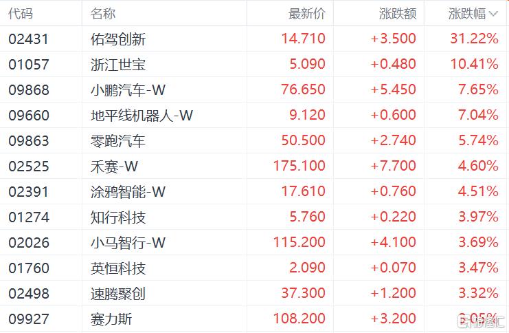 智能驾驶概念股集体走强,佑驾创新涨31.22%,浙江世宝涨10.41%,小鹏汽车-W、地平线机器人-W涨超7%,禾赛-W、知行科技、速腾聚创跟涨。
